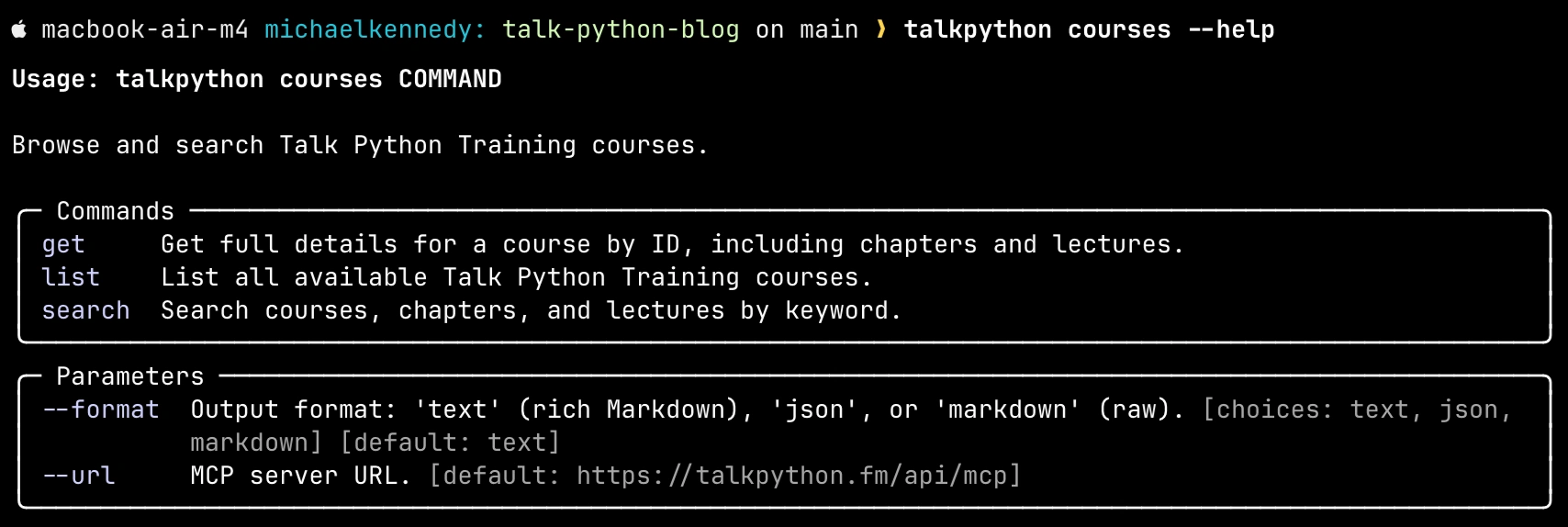 TL;DR: Talk Python now has an open-source CLI tool (talk-python-cli) that lets you search 500+ podcast episodes, transcripts, guests, and training courses directly from your terminal. Install it with uv tool install talk-python-cli. It supports text, JSON, and markdown output: built for humans, scripts, and AI/LLMs alike.