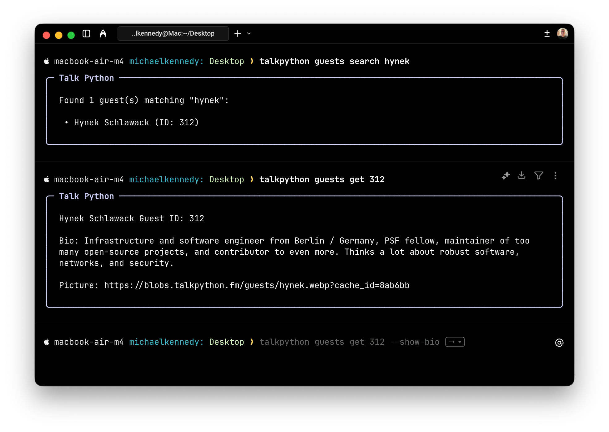 The CLI has a subcommand-style API. For example talkpython guest or talkpython episodes. Above is an example of combining the commands to find what you really want to know.